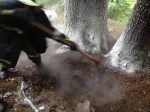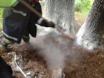 Die Gruppe des KLF konnte den Grund der Rauchentwicklung schlussendlich rasch entdecken. Ein Lagerfeuer zwischen zwei Bäumen!!!, ca. 15 m des Strommastens einer 110 kVA- Freileitung entfernt , hatte sich auf dem, trotz der vergangenen Niederschläge, trockenen Waldboden ausgebreitet und somit zu einer starken Rauchentwicklung geführt. Mit zwei Feuerlöschern konnte der Brand rasch eingedämmt und gelöscht werden. Zur Lokalisierung von eventuellen Glutnestern wurde der Boden im Bereich der Brandstelle aufgelockert und umgegraben. Restliche Glutnester konnten somit abgelöscht werden. Man kann hier nur von Riesenglück sprechen, dass sich der Brand nur sehr zäh und langsam ausgebreitet hat.