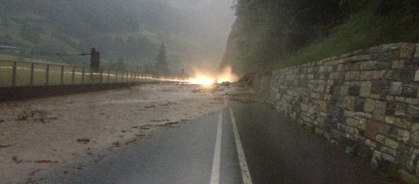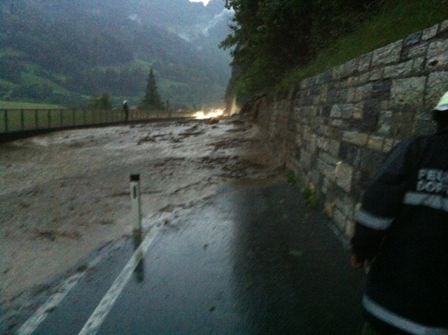 Die Einsatzmannschaft des RLF-A 2000 hatte als erstes eine Verklausung eines kleinen Baches im Bereich Maierhofen Nordeinfahrt zu bewältigen, welche eine Überspülung der Bundesstraße mit sich brachte.. Diese Einsatzstelle konnte relativ rasch unter Kontrolle gebracht werden und somit begab sich das RLF-A 2000 weiter Richtung Klammstein. Ca. 1 km weiter talauswärts kam es zu einer massiven Vermurung der Gasteiner Bundesstraße. An dieser Einsatzstelle angekommen, stellte sich folgende Lage dar: Die Bundesstraße war in einer Höhe von bis zu 2 Metern komplett vermurt, die Mure drohte in weiterer Folge über die Abgrenzungsmauer der Bundesstraße zu den Gleisanlagen der ÖBB überzuschwappen. Ein Fahrzeug wurde durch die Mure erfasst, Personen kamen dabei aber zum Glück nicht zu Schaden. Das Fahrzeug wurde umgehend aus dem Gefahrenbereich befreit. Kurz danach ging wiederum eine Mure an der selben Stelle ab, die eingesetzten Kräfte konnten sich noch rechtzeitig in Sicherheit bringen. Die Gefahr des Überschwappens auf die Gleisanlagen wurde durch die zweite Mure erheblich verschärft und konnte erst unter dem Einsatz von schwerem Gerät gebannt werden.