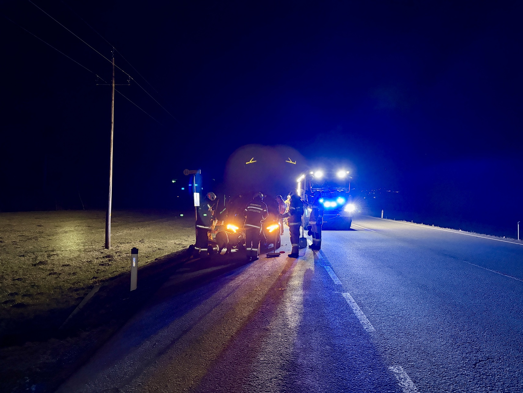 An der Einsatzstelle angekommen konnte dann rasch Entwarnung gegeben werden. Die Polizei war bereits vor Ort und konnte bei der Ersterkundung keine eingeklemmten Personen feststellen – es handelte sich um einen Auffahrunfall mit zwei beteiligten PKW’s. Somit war unsere Aufgabe das Absichern der Einsatzstelle, die Errichtung des Brandschutzes, das Ausleuchten der Einsatzstelle sowie die Einrichtung einer einspurigen Verkehrsregelung. Der Einsatz für die auf der Anfahrt befindliche Feuerwehr Bad Hofgastein konnte storniert werden. Das Rote Kreuz übernahm in weiterer Folge die Betreuung einer involvierten Person.
