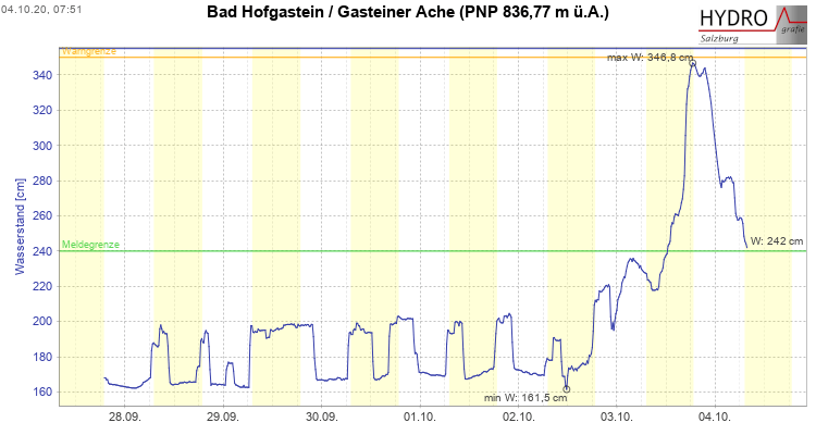 Den Höchststand an der Pegelmessstelle in Bad Hofgastein erreichte die Ache gegen 15:30. Der Stand betrug 4 m bei einem Durchfluss von 190 m³ Wasser pro Sekunde. Dieser Wert liegt über dem angesetzten Stand für HQ30 (30- jähriges Hochwasser). Die Ache uferte dann in vielen Bereichen im Oberlauf des Flusses aus, was zu Beeinträchtigungen auf den Verkehrswegen führte. Zwei Objekte waren zwischenzeitlich abgeschnitten.