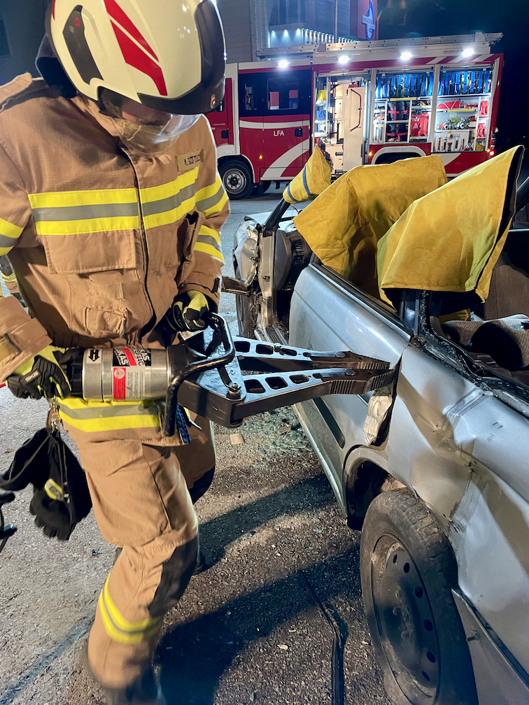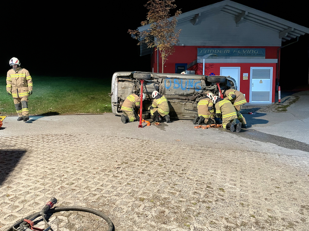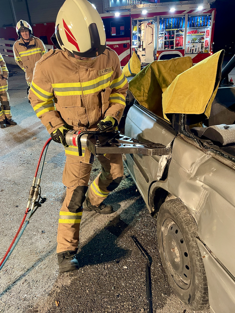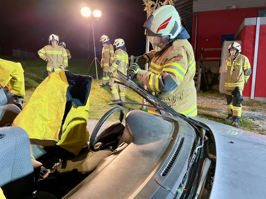 Mittels hydraulischen Rettungsgerät, Abstützsystem, Säbelsäge und weiteren Hilfsmitteln wurde eine Personenrettung aus einem verunfallten PKW beübt. Ebenso wurden die verschiedenen Öffnungsmöglichkeiten erprobt.